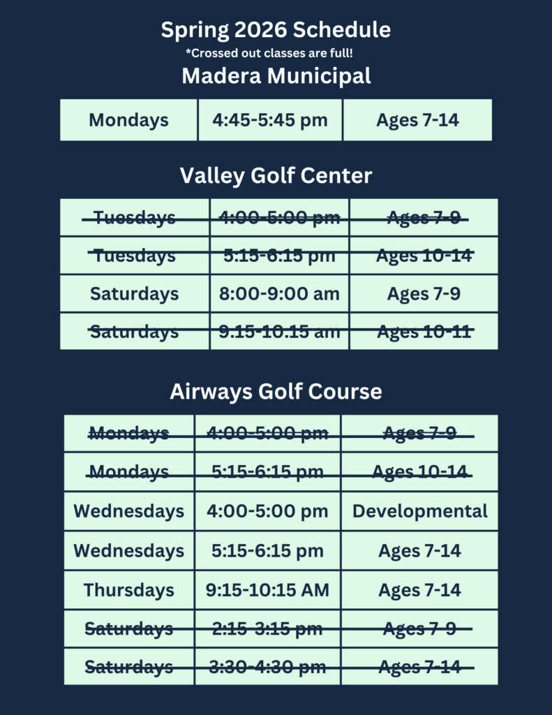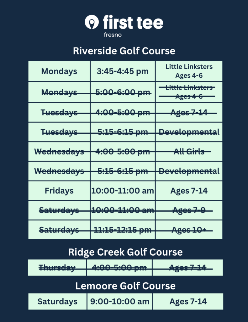 If you plan to participate in First Tee classes by using charter school funds through Yosemite Valley Charter or Monarch River Academy, please follow these steps: Please click on the registration button above and select the class of your choice for the session. When getting to the payment portion of the registration, request financial aid. By requesting financial aid, you will be securing your spot in the class. After doing this, please request an enrichment certificate for our services through your charter school. They will reach out to us after this has been processed through and your registration will be complete! For further questions, please call (559) 277-9565 or email [email protected]